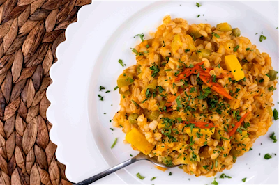 Barley risotto is a delicious vegan risotto dish – that’s also a healthier alternative to Arborio rice because it’s lower in fat and GI (glycemic index) while also being high in fiber. Barley gives the risotto a nuttier undertone, which pairs extremely well with lemon and parsley.